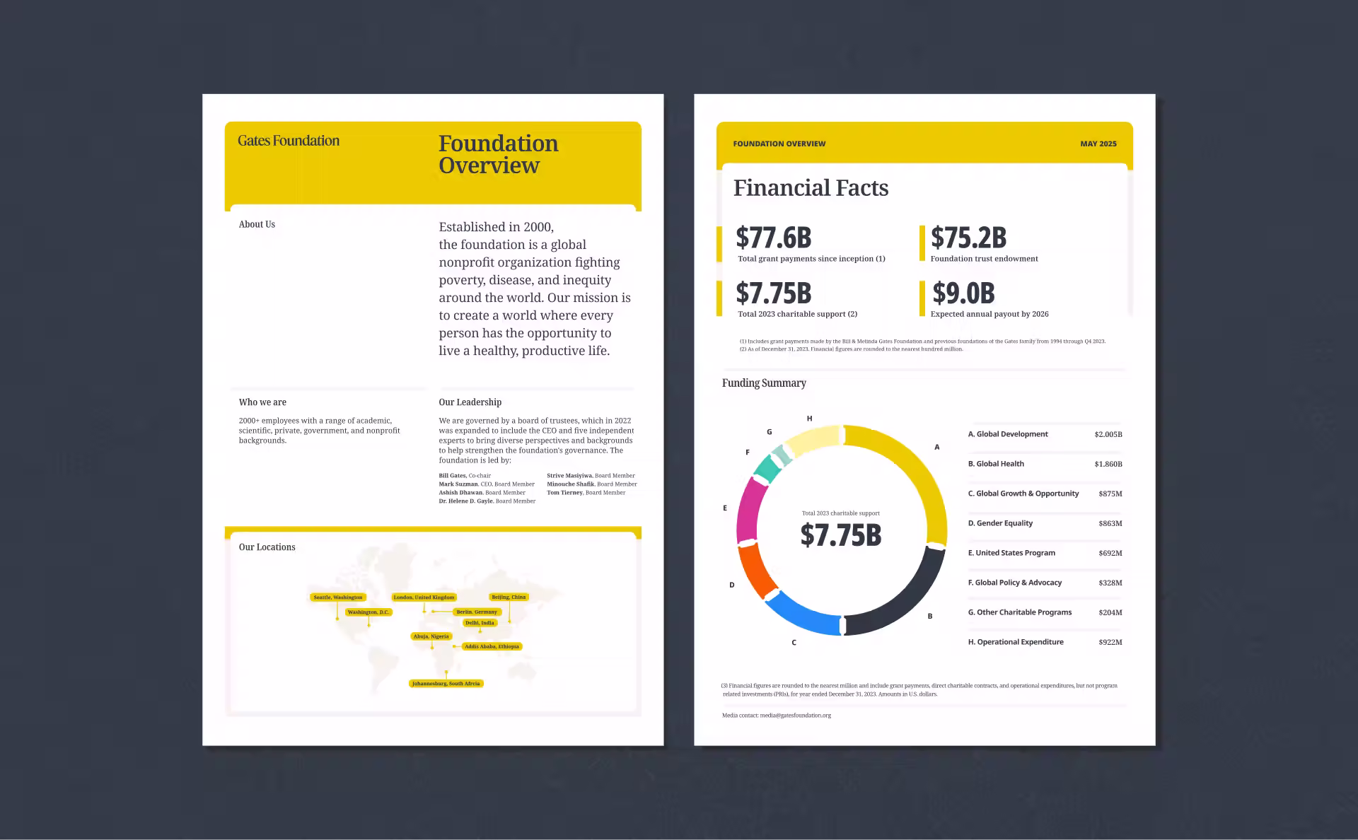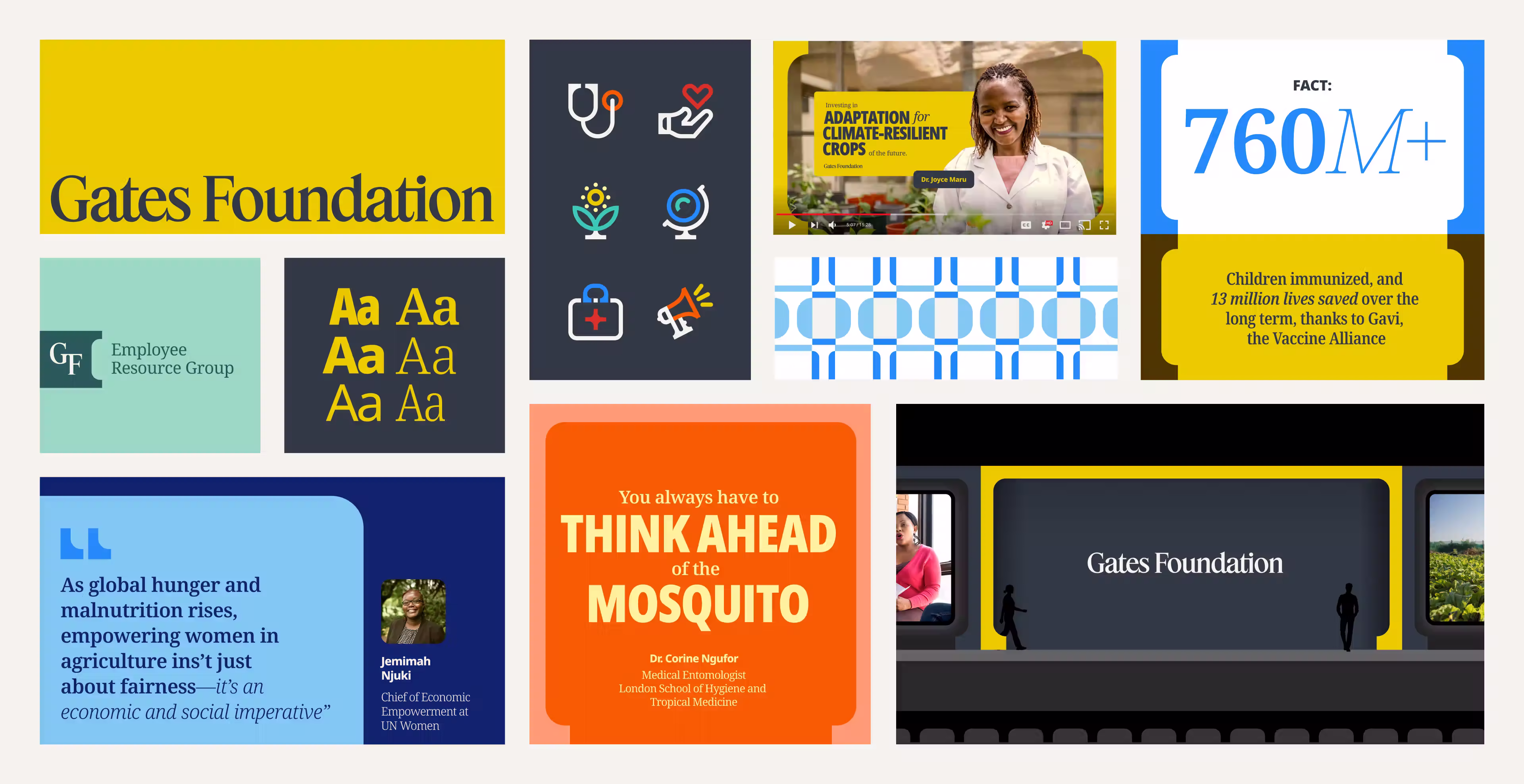The gates are utilized as a tool to dynamically frame the content that documents the foundation's real-world impact. They expand, collapse, and reorient to support stories, photography, video, quotes, and data across the brand.